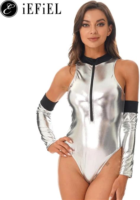Womens Alien Costume Metallic Sleeveless Leotard Bodysuit With Oversleeve Halloween Cosplay Party