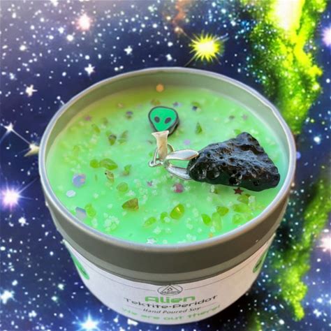 ALIEN CANDLE- 4Oz Glow In The Dark Alien Candle, Infused With Peridot Chips, Genuine Tekitite Charm, Lime Essential Oil, Ufo Candle