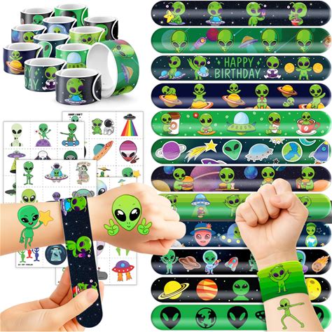 Cherisnowy 72 PCS Alien Party Favors 48 Tattoos Sticker And 24 Slap Bracelets Wristbands Perfect For Space Themed Birthday Baby Showers Or Classroom